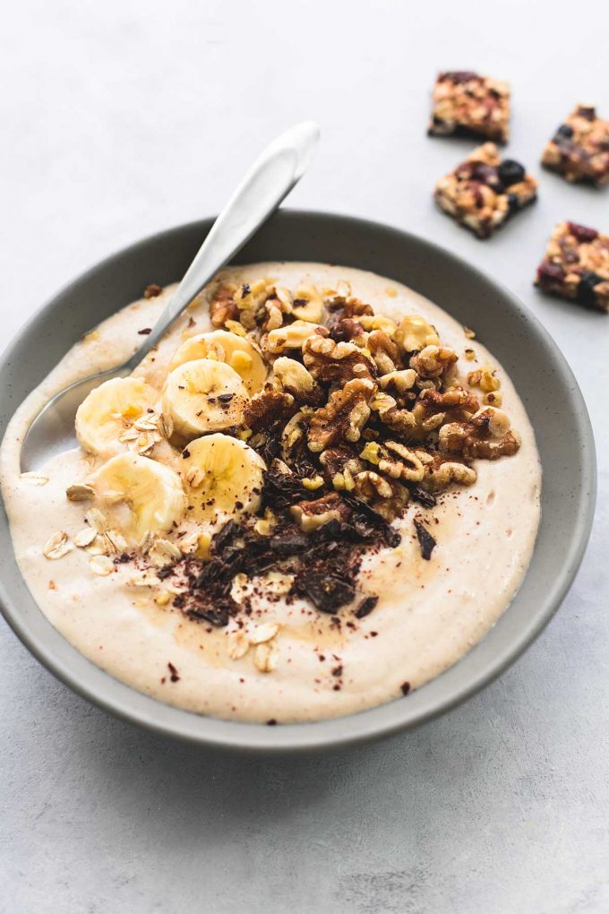- Από πάνω, toppings: φρεσκοκομμένη μπανάνα, κομματάκια μαύρης σοκολάτας, ξηροί καρποί της αρεσκείας σου.